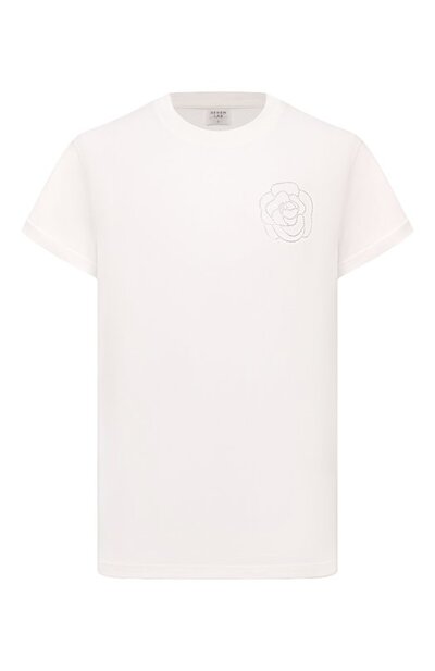 Футболку прямого кроя выполнили из чистого хлопка. Спереди модель с отворотами на рукавах декорировали розой из граненых стразов.
