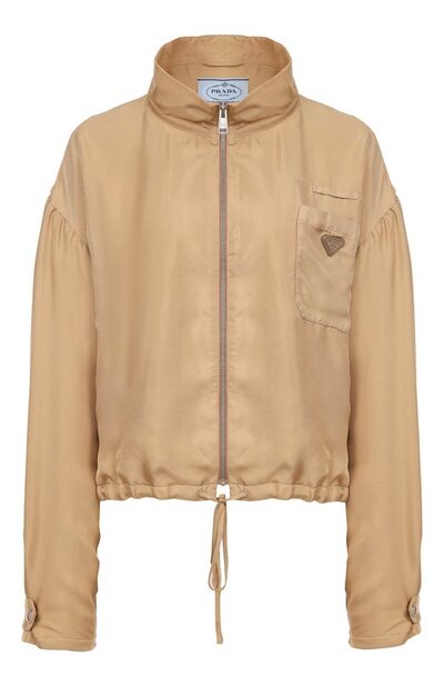 Куртку с регулируемым поясом-кулиской и манжетами на кнопках выполнили из шелкового твила. Модель с воротником-стойкой дополнили нашивкой над нагрудным карманом, украшенным фирменным эмалевым треугольником.