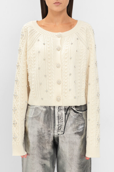 Укороченный кардиган YANA с изящным округлым вырезом горловины. Для создания модели молочного оттенка используется мягкая пряжа на основе кашемира и мериносовой шерсти. Особенностями изделия являются вязка лицевой гладью, фактурный узор «косы», геометрические мотивы ромбами и в виде полос, а также крупные мерцающие стразы-кристаллы. Горловина, планка застёжки, манжеты рукавов и пояс подобраны на резинку для оптимальной посадки.