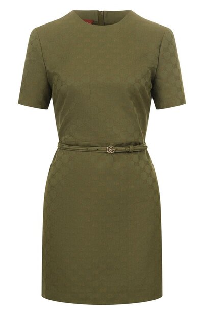 Для пошива мини-платья с жаккардовым паттерном GG использовали габардин из хлопка и полиэстера. Модель с боковыми карманами застегивается молнией сзади. В комплекте – кожаный ремень с пряжкой-монограммой.