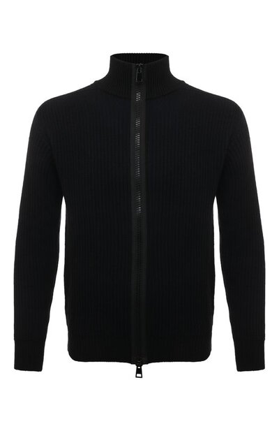 Лаконичный темно-синий кардиган со встречной молнией и высоким воротом, украшенным сзади миниатюрной эмблемой, сохранит ощущение комфорта и на улице, и в помещении. Оптимальный микроклимат поддержит мягкая шерсть, которую для легкости переплели с хлопковой пряжей. Модель связали в технике английской резинки, поэтому она хорошо сядет по фигуре, не будет мяться и не потеряет форму со временем.