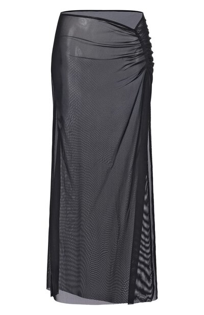 Юбку Claudia выполнили из сетки на основе переработанного нейлона с добавлением лайкры. Слева модель украсили драпировкой, которая переходит в высокий разрез.