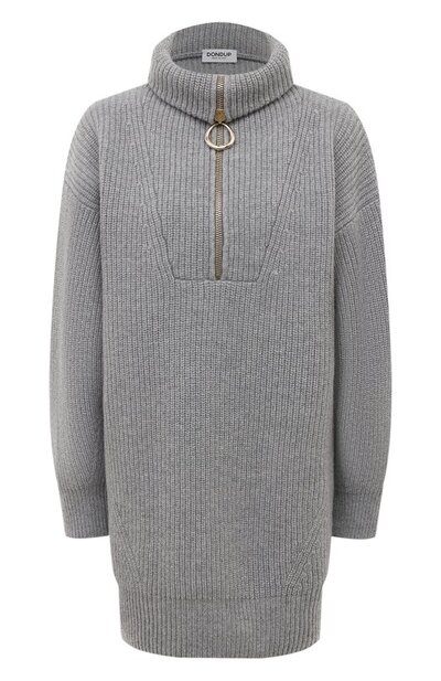 Короткое серое платье с объемными длинными рукавами и высоким воротом обеспечит комфорт в прохладный день. За поддержание оптимального микроклимата отвечает мягкая фактурная шерсть, которую использовали для изготовления модели. Сырье тщательно обработали, чтобы в пряжу не попали грубые волокна. Роль акцента отдали каплевидному пуллеру на молнии спереди.
