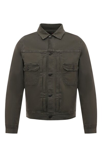 Создавая темно-зеленую джинсовую куртку, дизайнеры марки взяли за основу архивную модель, позаимствовав у нее небольшие графичные складки. Нагрудные карманы при этом немного сместили вниз. Для пошива изделия использовали плотный мягкий хлопок с добавлением эластана. Швы акцентировали искусственными потертостями.