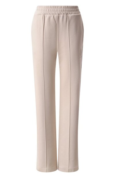 Брюки из хлопкового трикотажа с добавлением полиэстера дополнили задним прорезным и боковыми карманами. Модель с простроченными стрелками украсили вышитыми в тон логотипом и эмблемой.