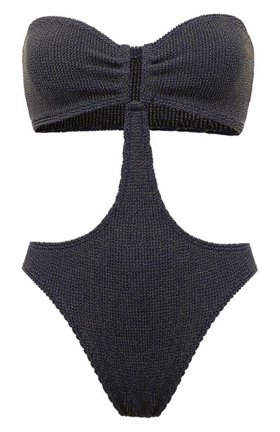 Темно-синий купальник-монокини в лучах света покрывается мелкими бликами, словно прибрежные волны в солнечный день. Блеск создают золотистые металлизированные нити, вплетенные в эластичный материал Maxxam с характерной фактурой. Жатый текстиль скрывает прочную вставку между мягкими чашечками, которая формирует U-образный вырез и одновременно помогает модели без бретелей поддерживать грудь.