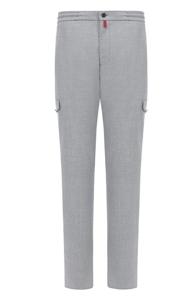 Брюки с боковыми и задними карманами дополнили карго с клапанами. Модель из шерстяной фланели украсили ярлыком фирменного алого оттенка спереди и жакроном с логотипом на регулируемом поясе сзади.
