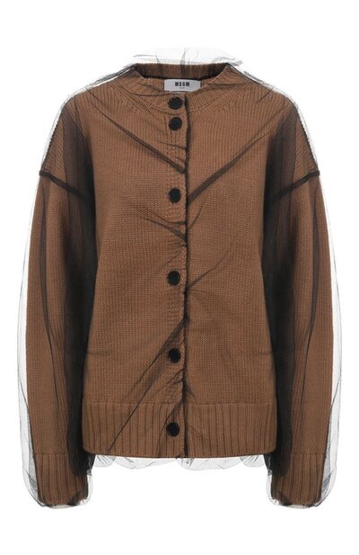 Кардиган, словно окутанный полупрозрачным тюлем, связали из шерстяной пряжи. Модель с отделкой в рубчик и брендированным патчем на спинке застегивается пуговицами.