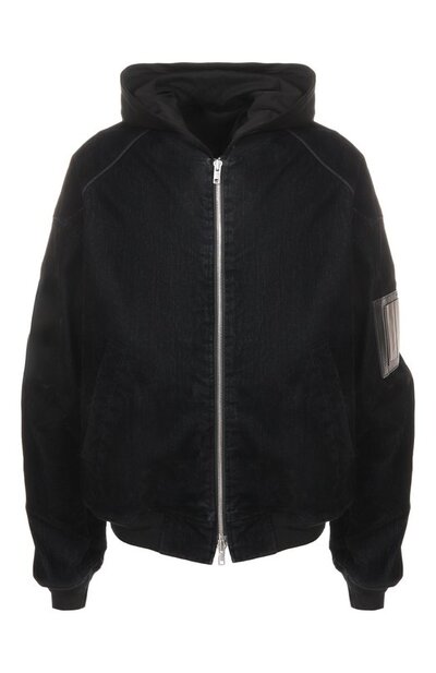 Утепленный бомбер свободного кроя выполнили из денима с бархатистой фактурой. Куртку со съемным регулируемым капюшоном и боковыми карманами дополнили брендированной кожаной нашивкой на рукаве.