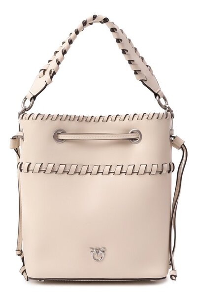 Сумку Bucket со съемным плечевым ремнем сшили из матовой кожи. Модель с накладным внутренним карманом и застежкой-кулиской украсили стичингом и эмблемой Love Birds.