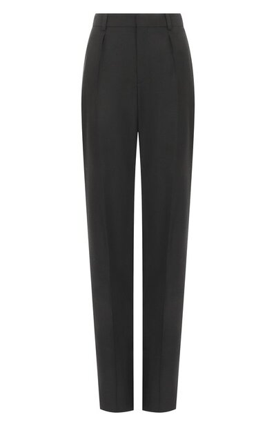 Брюки с защипами, переходящими в отутюженные стрелки, выполнили из костюмной шерсти. Помимо боковых карманов предусмотрели пару задних на пуговицах.