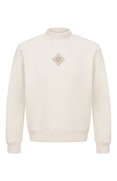 Свитер с манжетами, поясом и горловиной в рубчик выполнили из напоминающего стриженую овчину материала на основе шерсти, вискозы и кашемира. Спереди модель декорировали брендированным патчем с кристаллами и жемчужными бусинами.