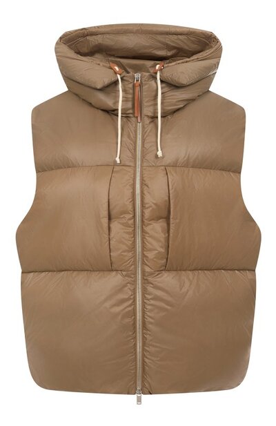 Стеганый пуховый жилет с регулируемым капюшоном выполнили из вторичного нейлона. Модель с боковыми и нагрудными карманами застегивается встречной молнией.