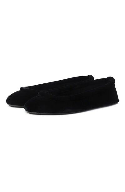 Балетки на плоской резиновой подошве выполнили из бархата, усилив изнутри тонкой кожей. Вырез модели подчеркнули объемным кантом.