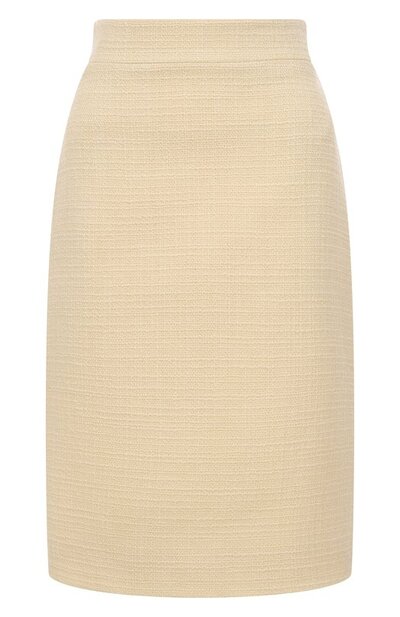 Юбку на атласном подкладе выполнили из шерстяного твида оттенка Almond. Модель с широким поясом и шлицей застегивается потайной молнией сзади.