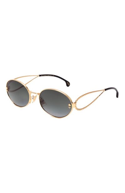 Овальные очки с регулируемыми носоупорами изготовили из металла с золотистым покрытием. На фигурных дужках предусмотрели длинные заушники из ацетата. Градиентные линзы украшены миниатюрными цветами.
