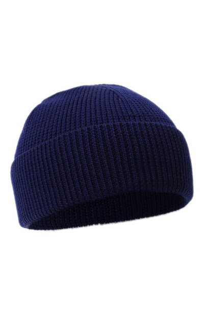 Эластичная синяя шапка без декора выполнена в технике английской резинки из приятной на ощупь шерстяной пряжи с шелковистыми тонкими волокнами. Однотонный аксессуар с рельефными узорами и широким отворотом плотно облегает голову, не электризует волосы и не растягивается со временем.