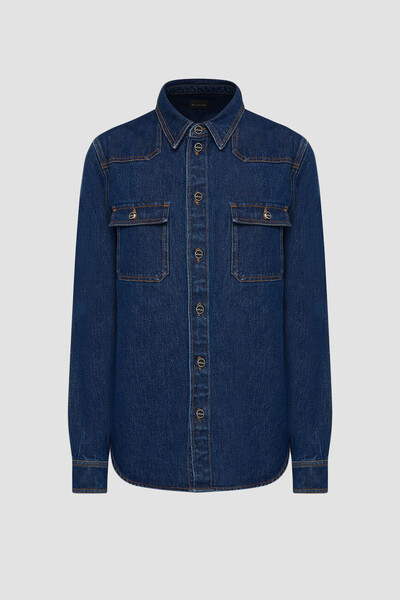 Синяя рубашка Kiton с оранжевой прострочкой на швах. Для производства вневременной модели выбран эластичный хлопковый деним с эффектом делаве. О принадлежности изделия с двумя нагрудными накладными карманами с клапанами Дому деликатно напоминают лого на круглых металлических пуговицах с эмалированным центром. Рубашка, переосмысленная с учётом современного комфорта, станет основой женских casual-комплектов.