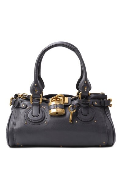 Сумку Paddington с боковыми ремешками выполнили из зернистой кожи буйвола. Модель с парой внешних отсеков, как и внутренний карман, застегивается молнией. Аксессуар с заклепками дополнили небольшим клапаном с петлей для съемного брелока-замка с ключом.