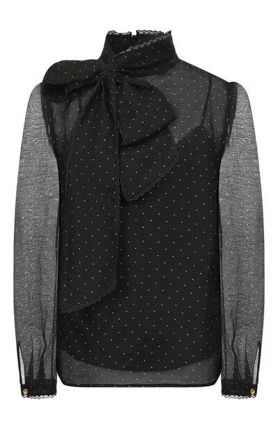 Блузку Dream Pussybow в горох выполнили из полупрозрачной ткани на основе льна и шелка, а для отделки использовали кружево. Модель из коллекции Hypnotic, дополненная воротником аскот, застегивается потайной молнией сзади. В комплекте – нижний топ из вискозы.