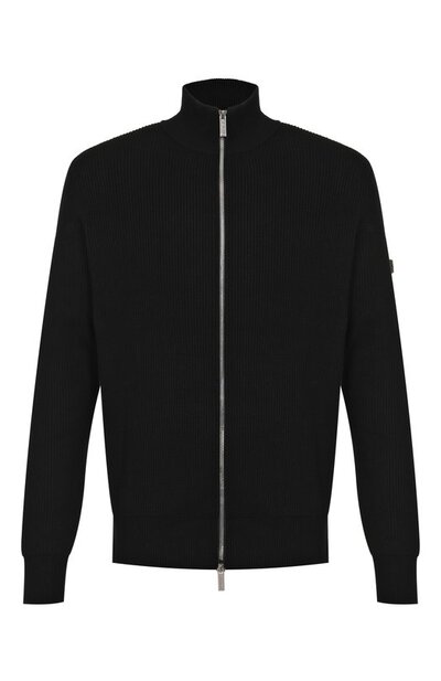 Кардиган с высоким воротником выполнили из ребристого трикотажа на основе акрила и хлопка. Рукав модели на встречной молнии дополнили брендированной нашивкой.