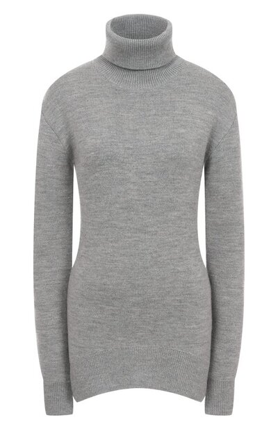 Свитер с высоким воротником, манжетами и изогнутым поясом в рубчик выполнили из шерстяного трикотажа. Модель с разрезами по бокам легко впишется в базовый гардероб.