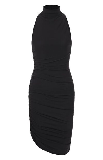 Облегающее мини-платье с драпировками сшили из эластичного ацетатного джерси. Модель с высоким воротником-стойкой, глубокими проймами и асимметричным подолом застегивается потайной молнией сбоку.