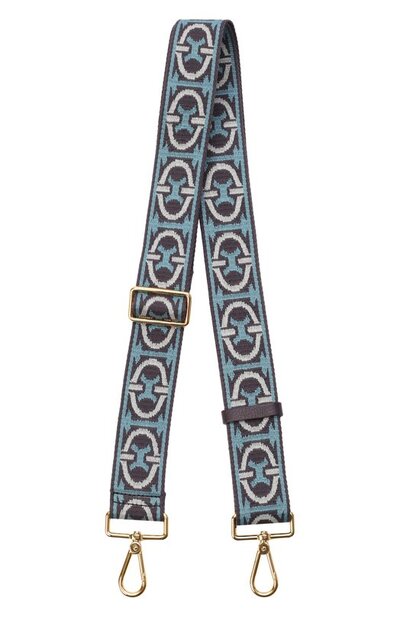 Ремень выполнили из ткани с трехцветным жаккардовым узором из фирменной монограммы. Регулируемый аксессуар на поворотных карабинах отделали кожей.