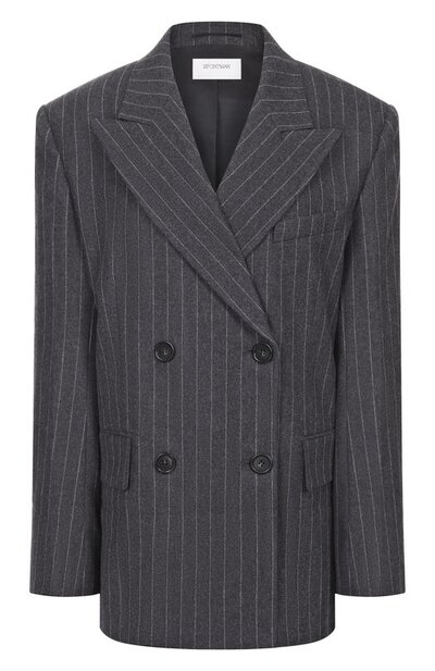 Двубортный жакет Belford в меловую полоску выполнили из костюмной стрейчевой ткани на основе шерсти первого пострига и вискозы. Модель свободного кроя дополнили врезными нагрудным карманом и боковыми с клапанами.
