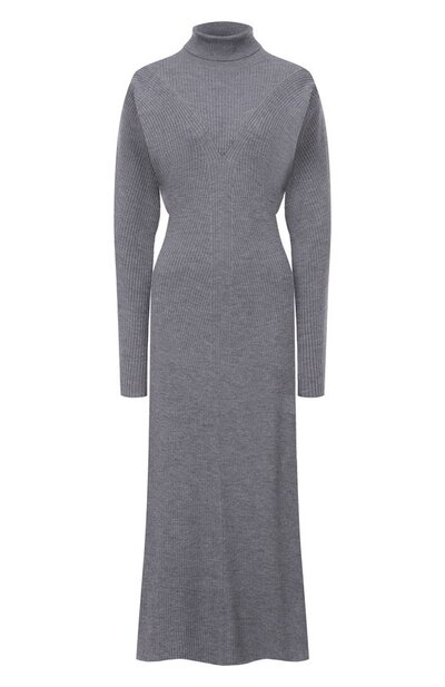 Приталенное миди-платье с воротником-стойкой и рукавами реглан выполнили из шерстяного трикотажа в рубчик. Эластичную модель с расклешенным подолом украсили брендированной пластиной сзади.