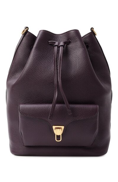 Сумку Beat Generatio со съемным регулируемым ремнем выполнили из зернистой кожи. Сама модель затягивается шнуром в кулиске, внутренний карман закрывается молнией, а внешний – клапаном с пряжкой в форме фирменного плектра.