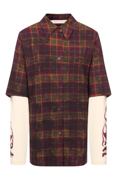 Клетчатую рубашку дополнили трикотажными рукавами с мотивом Flames, создав иллюзию многослойности. Oversize-модель из твила на основе вискозы и полиэстера украсили брендированной нашивкой под воротником сзади.