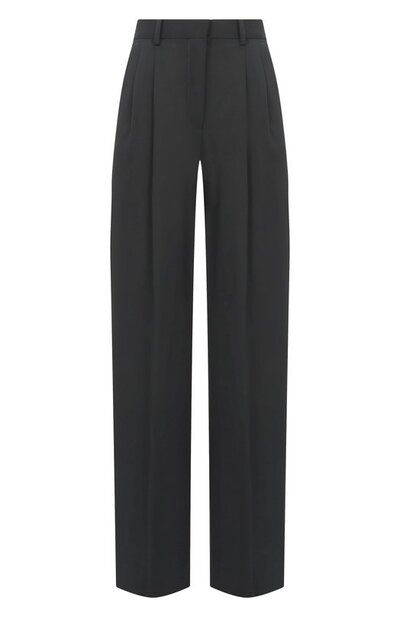 Брюки с двойными защипами под передними шлевками выполнили из шерсти с добавлением эластана. Модель дополнили двумя боковыми карманами и задним на пуговице, обтянутой такой же тканью.