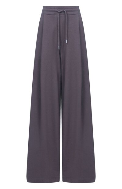 Широкие расклешенные брюки с глубокими складками спереди выполнили из хлопкового трикотажа. Модель с регулируемым поясом-кулиской дополнили боковыми и задним карманами.