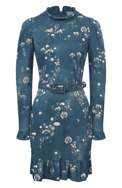 Приталенное мини-платье с оборками на горловине, рукавах и подоле сшили из эластичного шелка с цветочным принтом. Модель, застегивающуюся потайной молнией сзади, дополнили съемным поясом с пряжкой.