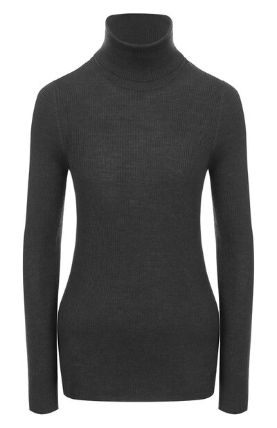 Облегающую водолазку в рубчик выполнили из тонкой шерсти с добавлением шелка и кашемира. Сбоку модель с отворотом на высокой горловине декорировали вышитой в тон эмблемой.