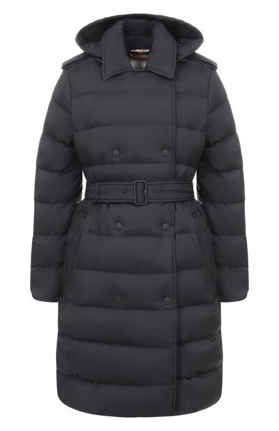 Двубортное стеганое пальто на гусином пуху сшили из матового нейлона. Модель с погонами и двумя карманами на кнопках дополнена съемными деталями: регулируемым капюшоном и поясом с пряжкой в форме буквы B. Отложной воротник отделали снизу тканью в фирменную клетку Burberry Check.