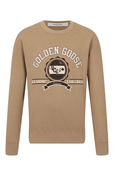 Свитшот с отделкой в рубчик выполнили из хлопкового трикотажа. Модель декорировали потертым брендированным принтом спереди и двумя фирменными звездами на спинке.