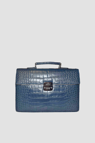 Функциональный портфель Artioli из мягкой телячьей кожи синего оттенка. Изделие отличается тиснением под крокодила и наличием одного просторного отделения с откидным клапаном на цифровом кодовом замке. О принадлежности практичного аксессуара Дому деликатно напоминает гравировка со знаковой символикой на замке, серебристых пуллерах и заклёпках у основания ручки.