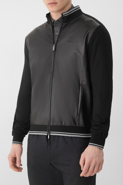 Куртка ZILLI на встречной молнии с двумя брендированными пуллерами. Для производства комбинированной модели прямого силуэта используются мягкий трикотаж на основе хлопка, гладкого шёлка и прочного нейлона на спинке и рукавах и мелкозернистая кожа на вставке спереди в тон. Передняя полочка с деликатным блеском декорирована вышитой литерой «Z», заключённой в квадрат. Воротник-стойка, манжеты и широкий пояс обрамлены двумя светло-серыми полосами-окантовкой.