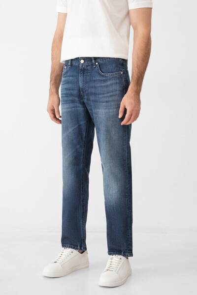 Синие джинсы Zilli с пятью традиционными карманами. Модель изготовлена из эластичного хлопкового денима средней плотности. Изделие с выбеленным эффектом и завышенной линией талии рифмуется и с неформальными футболками, и с тонким трикотажем.
