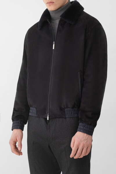 Бомбер ZILLI с отложным воротником из мягкого меха овчины. Модель изготовлена из бархатистой тёмно-синей замши и дополнена кожаными широким поясом и манжетами на резинке на несколько тонов светлее основы. Внутри - гладкая шелковая подкладка с брендированным принтом.