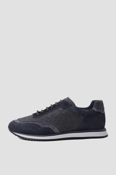 Комбинированные кроссовки Zilli с широкой колодкой. Изделие выполнено из войлока тёмно-серого оттенка с характерной текстурой и укреплено фигурными накладками из бархатистой тёмно-синей замши. Отличительными деталями являются вышивка в виде надписи-логотипа Дома в круге на язычке и вышитый неброский логотип в задней части. Модель надёжно фиксируется на ноге при помощи закрытой шнуровки с очерченной замшевой планкой.
