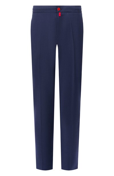 Брюки со стрелками и четырьмя карманами выполнили из костюмной шерсти. Модель с потайной кулиской на поясе украсили брендированным жакроном сзади и ярлыком фирменного алого оттенка спереди.