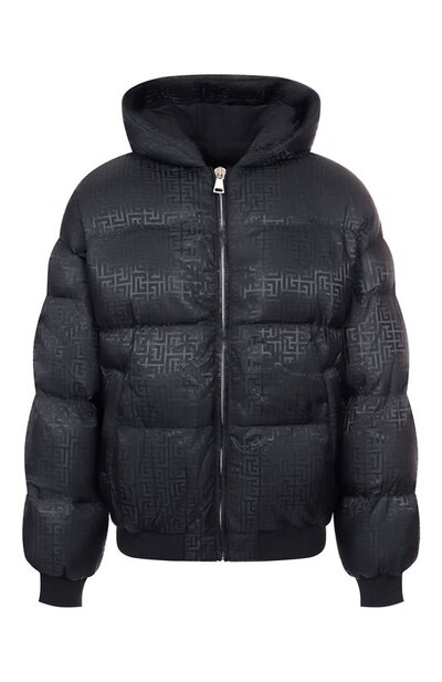 Пуховик с трикотажными манжетами и поясом выполнили из полиамида с фирменным узором PB Labyrinth. По бокам предусмотрели врезные карманы с листочками. Куртка с капюшоном застегивается контрастной молнией.