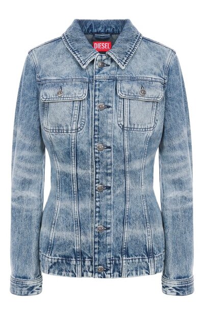 Джинсовую куртку De-Katerin-Fsh с двумя нагрудными карманами сшили из хлопкового денима с добавлением пеньки. Приталенную модель в готовом виде обработали лазером, камнями и ферментами для получения декоративных потертостей.