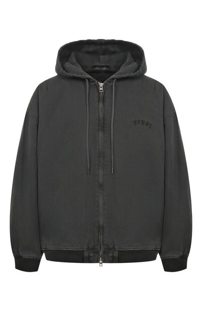 Куртку силуэта oversize выполнили из плотного хлопка. Небольшой логотип на груди вышили нитью в тон, а крупный сзади подчеркнули заклепками. Бомбер с регулируемым капюшоном, спущенной линией плеч и двумя врезными карманами дополнили манжетами и поясом из трикотажа.