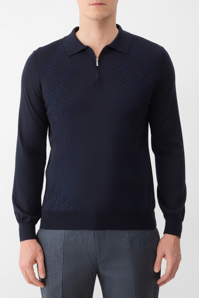 Трикотажное поло ZILLI с широким эластичным поясом и манжетами на резинке. Для создания изделия прямого силуэта выбрана кашемировая пряжа тёмно-синего цвета с добавлением гладких шелковых волокон. Отличительной деталью стал графичный жаккардовый узор спереди по бокам на несколько тонов светлее основы.