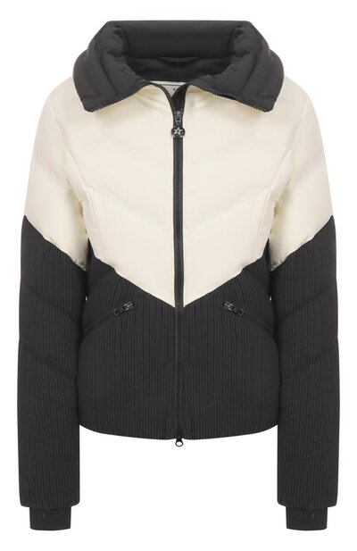 Стеганую куртку с шевронным мотивом и гофрированными вставками выполнили из нейлона с добавлением спандекса. Утепленная утиным пухом модель с манжетами-митенками, высоким воротником и боковыми карманами застегивается встречной молнией.