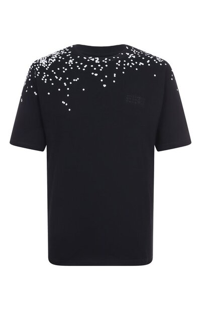 Футболку прямого кроя выполнили из хлопкового джерси. Модель с вышитым спереди знаковым числовым кодом в тон декорировали контрастным принтом, напоминающим конфетти.